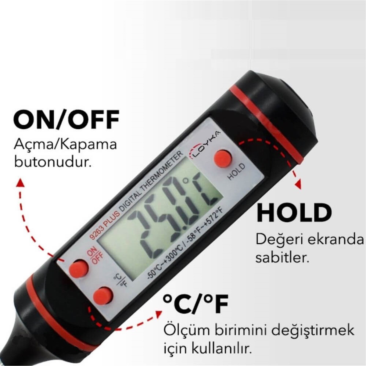 - Loyka 9263 plus problu termometre cihazı ile batırdığınız gıdaların veya sıvıların sıcaklığını kolay bir şekilde ölçebilirsiniz. - Cihazın probu 147 mm uzunluğunda ve paslanmaz çelik yapıdan oluşmaktadır. - Loyka 9263 plus gıda termometresinde bulunan LCD ekran ile ölçtüğünüz sıcaklık değerlerini kolayca görüntüleyebilirsiniz. - Cihazın ekran ve tuş takımı bölümü hariç olmak üzere; 147 mm prob uzunluğu bulunmaktadır. - Termometre üzerindeki ON/OFF butonu ile cihaz açıp kapatılabilmektedir. - °C/ °F birimleri ile ölçüm yapabilme özelliği vardır. Cihaz üzerindeki "°C/°F" butonuna basarak birimler arasında geçiş yapabilirsiniz. - Cihaz üzerinde bulunan "HOLD" butonu ile ekranda görülen ölçüm değerlerini sabitleyebilirsiniz. - "ON/OFF" butonu ile cihazı mauel olarak açıp kapatabilirsiniz. - Loyka 9263 plus termometre cihazı 1 adet LR44 pil ile çalışmaktadır. - Cihaz silindirik şeffaf bir kutuya sahiptir. - Cihazın paket içeriği; 1 adet Loyka 9263 plus saplama problu termometre, 1 adet LR44 1.5V pil ve kullanım kılavuzu ile birlikte gelmektedir.