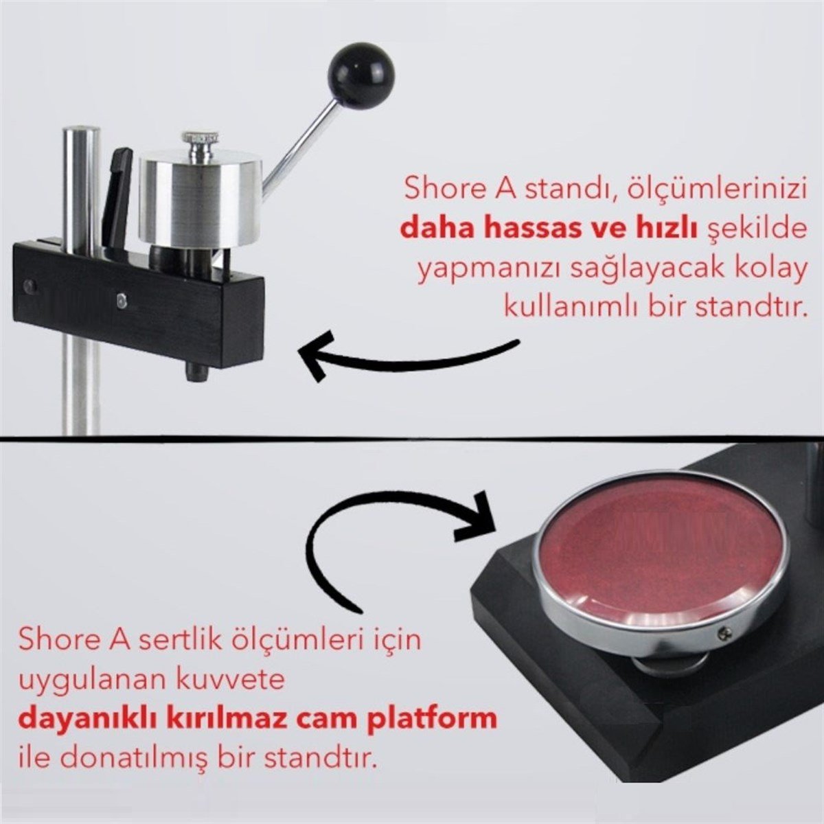 - Bu shoremetre standı ile sadece "SHORE A" yani yumuşak kauçuk, slikon gibi malzemelerin ölçümlerini yapabilirsiniz. - Shoremetre standı ile yapacağınız ölçümler size daha doğru sonuçlar verecektir. - Ayrıca shoremetrenizi bir kere standa bağladıktan sonra yapacağınız ölçümler daha kolaylaşacak ve hızlanacaktır. - Standa shoremetreyi bağlamak için, göstergenin üstündeki aparatı sökülür ve standa bu kısımdan döndürerek bağlanır. - Standın üst bölümü olan shoremetrelerin bağlandığı kolu ölçülen malzemenin büyüklüğüne göre aşağı ve yukarı hareket edebilmektedir. - Standın ağırlığı; 5.5 kg, boyutları ise; 30 x 25 x 17 cm' dir.